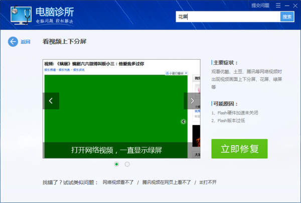 其次,如果在观看腾讯视频的时候不仅自动快进,同时还带有绿屏的现象。原因则可能是flash硬件加速未关闭或flash的版本过低,可以使用腾讯电脑管家来修复,方法如下:打开电脑管家——电脑诊所——上网异常——看视频上下分屏的解决方案,然后点“立即修复”即可。