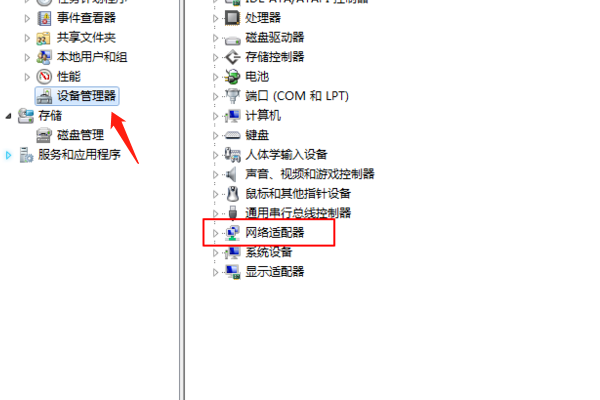 2、然后在弹出的菜单点设备管理器,然后点击右侧的网络适配器。