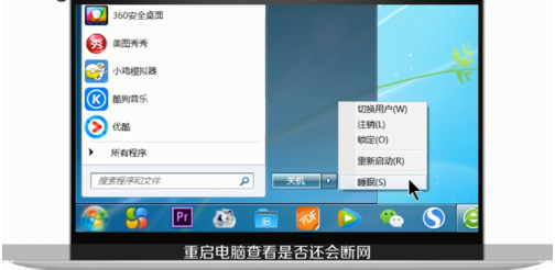 5、方法三:点击左下角“开始”按钮,点击“重新启动”,重启电脑查看是否还会断网。