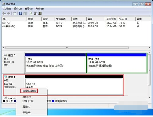 创建虚拟磁盘完成之后,还不能使用,需要初始化磁盘,在磁盘管理界面会多出一个"磁盘1",在"磁盘1"的位置右键,选择"初始化磁盘"。