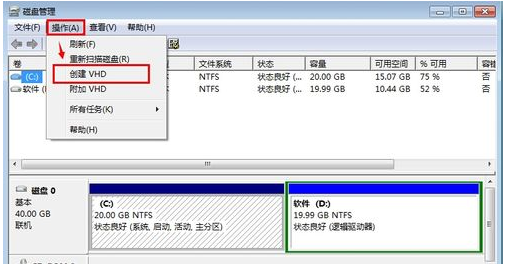 在"磁盘管理"界面,点击"操作"—"创建VHD"。
