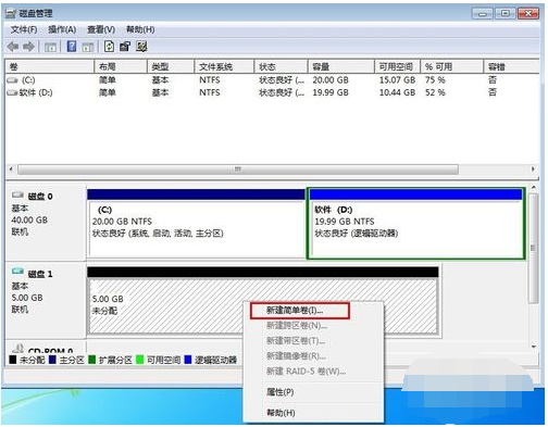 初始化完成之后,鼠标右键单击新建好的,并经过“初始化”的虚拟磁盘,在弹出菜单中选择"新建简单卷" 。