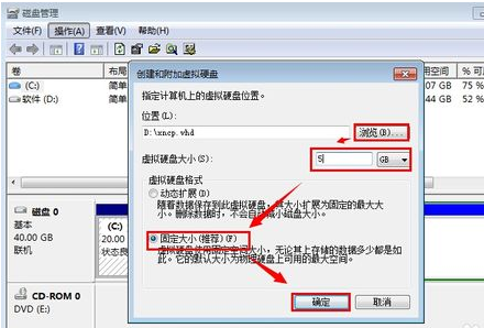 创建磁盘,选择磁盘文件存放位置,点击"浏览",弹出“浏览虚拟磁盘文件”窗口,设置好保存位置和文件名,点击“保存”。设置好虚拟硬盘大小,点击"确定"。