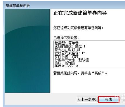 根据向导提示,指定卷大小、分配驱动器号和路径、格式化分区,最后单击“完成”按钮。
