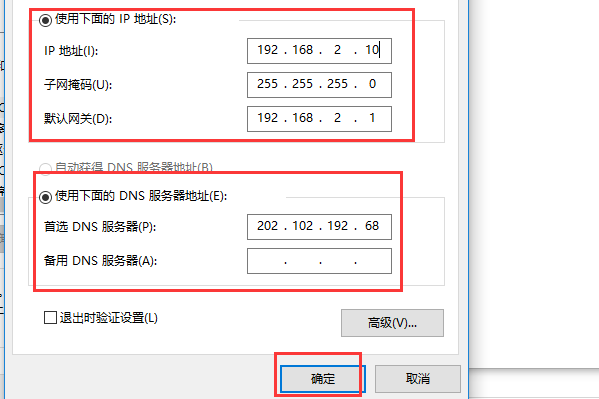 6、在出现的IP设置界面金钟勾选使用下面的IP地址和DNS服务器地址。然后输入与路由器网关相同号段的数字并点击确定按钮就完成该电脑固定IP地址的设置了。