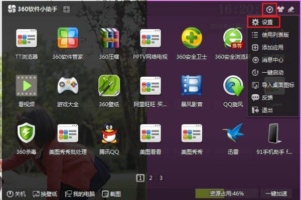 3. 然后重新打开360一键加速菜单按钮,点击右上角的 倒三角 ,点击 设置 按钮。