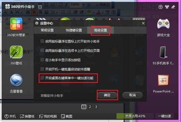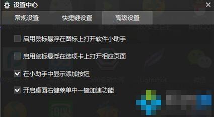4. 在 设置中心 界面点击【高级设置】,接着我们将下面选项中的【开启桌面右键菜单中一键加速功能】选项前的勾去掉,点击确定保存设置。