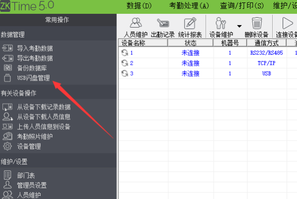 9、将U盘拔出以后插入到装有考勤机软件的电脑上,打开考勤机软件,点击左侧的USB闪盘管理。