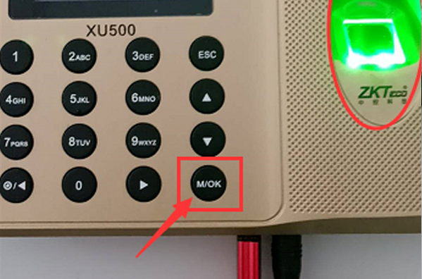 2、按下考勤机界面的OK键,使用管理员指纹按下打卡区域。