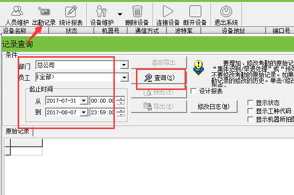 13、等待导入记录完成以后点击软件上面的出勤记录按钮进入,并在需要导出的记录里面选择人员范围和日期点击查询。
