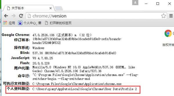 这时可以看到具体的“个人资料路径” C:\Users\用户文件名\AppData\Local\Google\Chrome\User Data\Profile 2