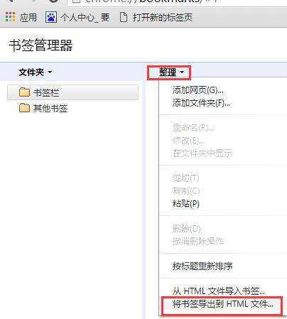 点击“整理”,弹出选择“将书签导出到HTML文件“。