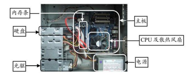 主机是台式电脑的主要部分,用于放置主板及其他主要部件。一般我们把位于机箱内的设备称为内设,位于机筘外的设备称为外设(如显示器、键盘、鼠标、外接硬盘和外接光驱等)。主机的内部结构如下图所示。