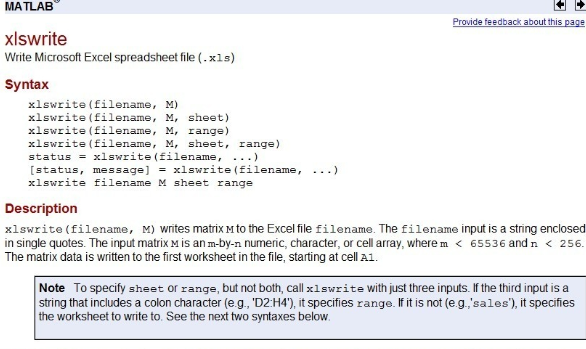 其中variable表示需要写入Excel文件的变量名称,filename.xls(或者filename.xlsx)表示excel数据文件,help帮助文档中对xlswrite()函数的介绍如下图所示: