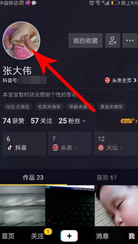 1、首先打开抖音,在我的选项下点击头像处。如图所示。
