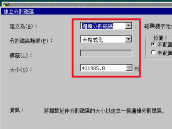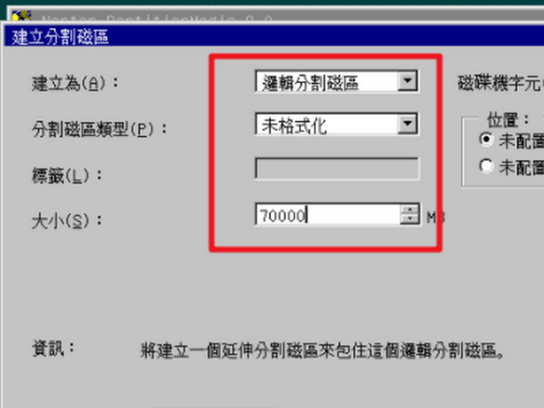 6、然后选择剩下的空间,继续建立逻辑分区,因为软件准备装在第二个盘,这个盘主要用来安装软件,那么70G就足够了。