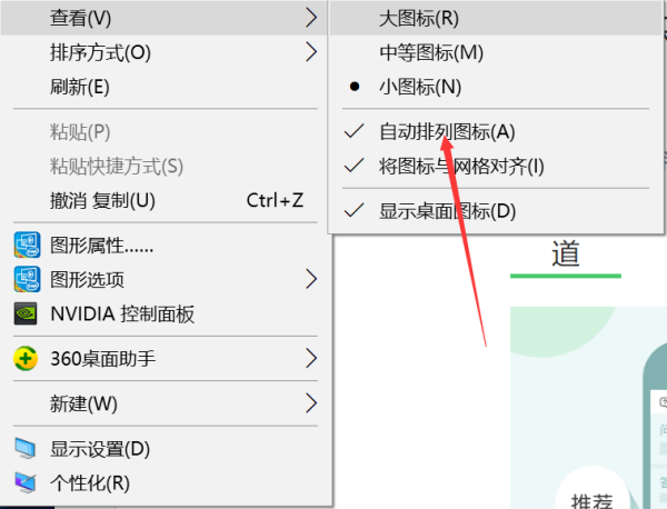 3、点击自动排列图标,此时,我们再按刚才的步骤操作,会发现“自动排列图标”前面的小对勾已经消失了。