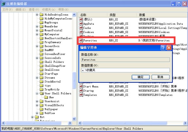 3、在左侧的窗格找到并双击名为‘Favorites’健值,在打开的窗口输入你希望收藏夹位于的路径,(例如:e:\收藏夹);
