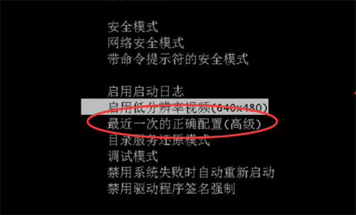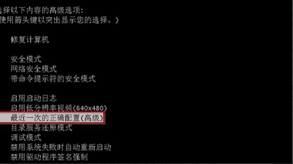 2、长按之后,即可成功进入高级启动选项的界面了,可以在界面上找到最近一次的正确配置选项,利用键盘上下键进行选择即可。