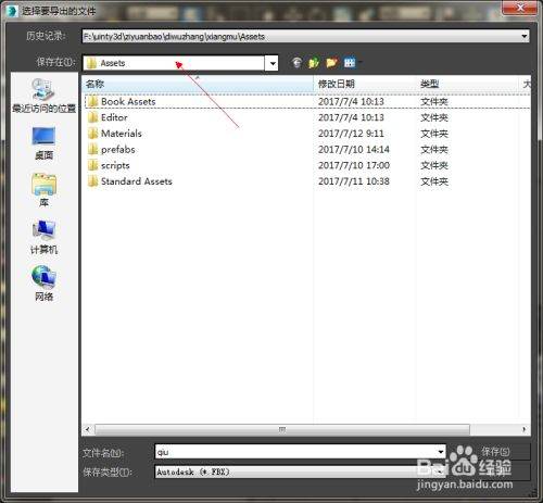 然后将模型导出成FBX格式,并把他保存在unity3d工程文件夹下的Assets文件夹下