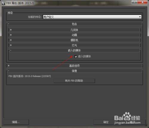 导出设置时需要在嵌入的媒体下勾选嵌入的媒体。