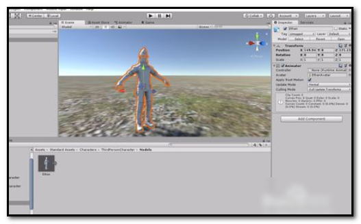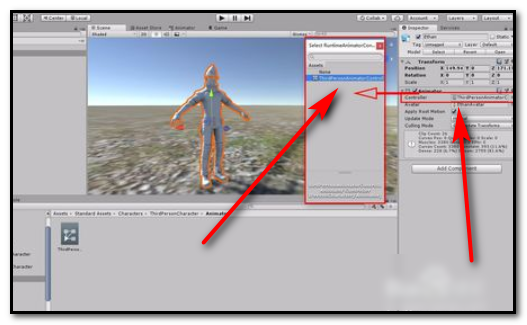 6、在Inspector面板中找到【Animator】选项中的【Controller】,然后点击右边的点,即导入自带的动画文件,如下图所示。