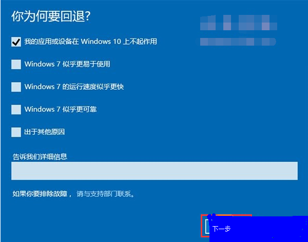 3、这时会弹出一份调查选择询问因什么原因退回(该项应该是便于微软收集反馈并完善Win10系统),选择一个你要退回的理由然后点击下一步