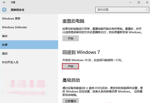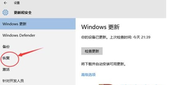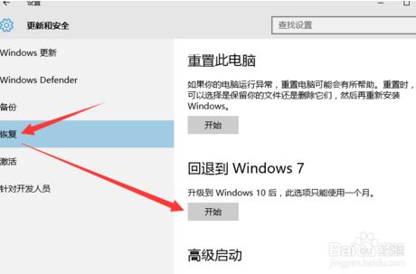 2、在更新和安全中选择“恢复”,并找到“回退到Windows7(或Windows