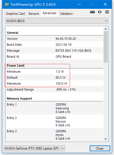 GPU-Z的第三个选项卡“Advanced”,然后在选项卡里面的下拉栏中选择“NVIDIA BIOS”就可以看到了。从上到下,最低功耗、默认功耗、最高功耗。