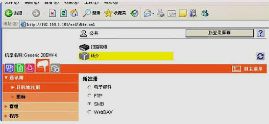 14、在地址栏中输入MFP的IP地址,单击“目标注册”,然后选择“新建注册”。