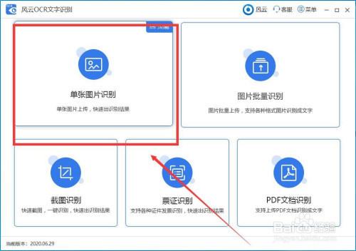 双击打开软件,选择“单张图片转文字”,如果需要转很多的话,也可以直接选择“图片批量识别”。