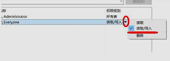 5、将Everyone的权限级别设置为读/写,然后单击共享。