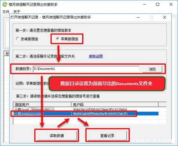 4,最后使用楼月微信聊天记录导出恢复助手,对Documents文件夹中的数据进行读取。