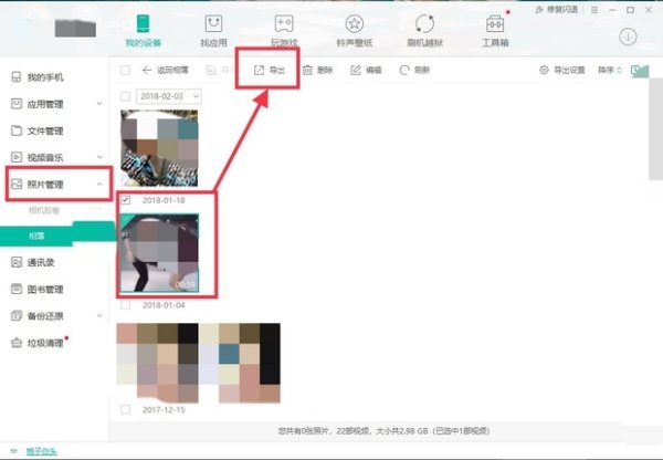 3、连接好手机以后,点击照片管理,然后选中需要转入电脑的视频,点击导入。