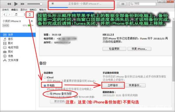 2,在电脑上使用iTunes软件,把苹果手机上的数据全部同步保存到本电脑上(即备份手机数据到电脑上),操作步骤及注意事项如下图所示: