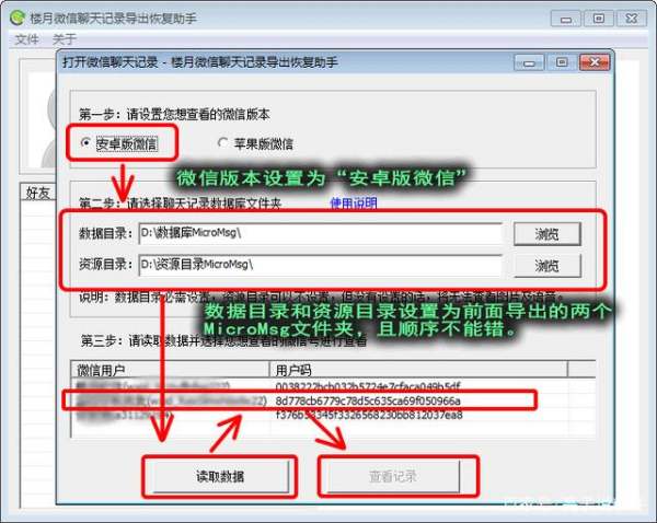 2,然后同样使用楼月微信聊天记录导出恢复助手软件,对备份到电脑上的安卓手机数据进行读取,有的安卓手机需要按提示输入手机的IMEI码或MEID码对微信数据进行解码读取。