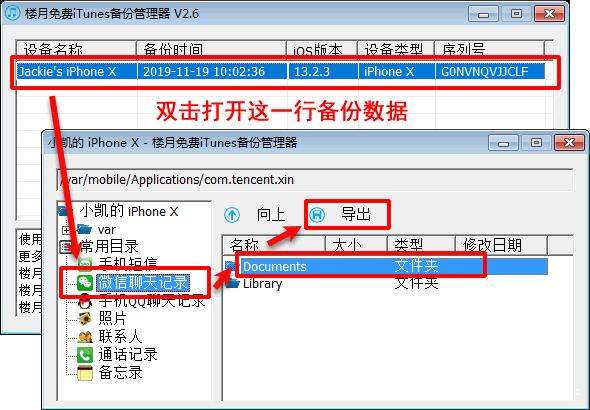 3,使用iTunes软件同步手机数据到电脑后,接着要使用楼月免费iTunes备份管理器,将保存了微信聊天记录的Documents文件夹从备份数据中导出来。