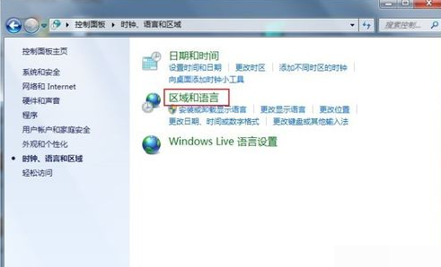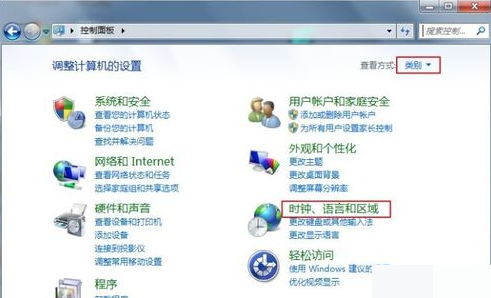 2、然后,在控制面板界面右上角选择类型,然后点击下面的“时钟、语言和区域”选项: