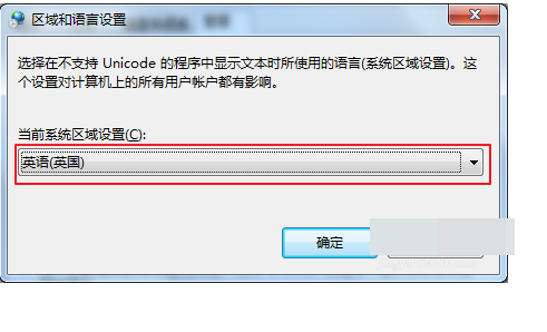 5、然后,在弹出的窗口中将系统区域设置成“英语(英国)”,然后点击确定,重启电脑: