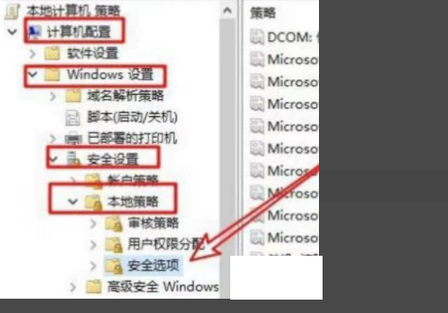 3、依次点击计算机配置-Windows设置-安全设置-本地策略-安全选项。