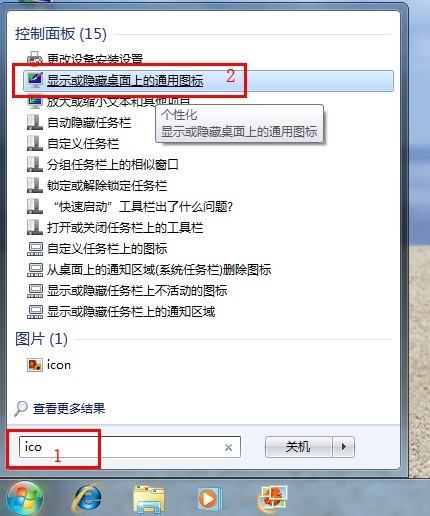 在开始菜单的搜索栏里输入"ico",选择“显示或隐藏桌面上的通用图标”,勾选所需要的图标然后点击应用。