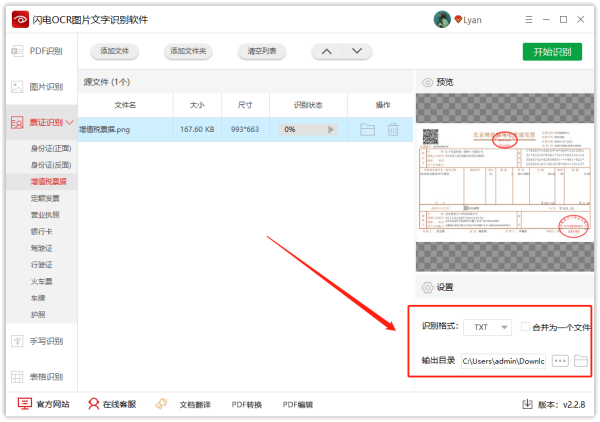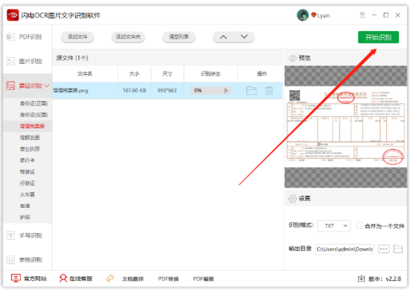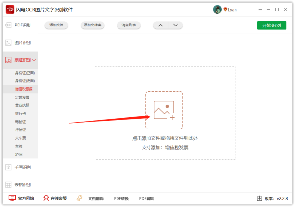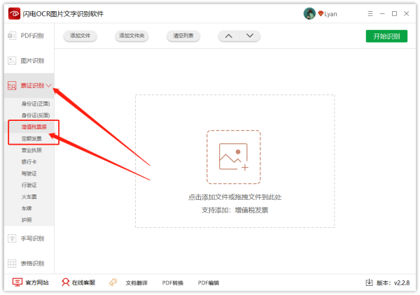 第一步、打开ocr识别软件后,在这里点击选择需要翻译的内容“票证识别”-“增值税票”;