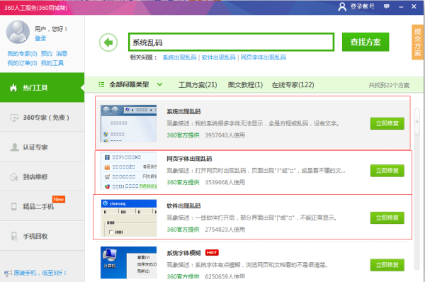 2、在弹出窗中直接搜索”系统乱码“,即可搜索出解决方法。直接点击立即修复。修复完毕重启电脑即可。
