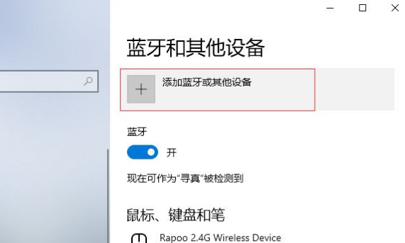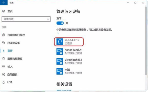 2、打开之后发现,蓝牙默认是开着的,当然了,若是您的系统是关闭的,请用鼠标点到右边位置,打开蓝牙之后,电脑会自动搜索区域内的蓝牙设备,这里也显示了我们的蓝牙耳机型号;