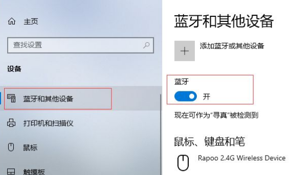 2、进入到“蓝牙和其它设备”点击打开“蓝牙”。