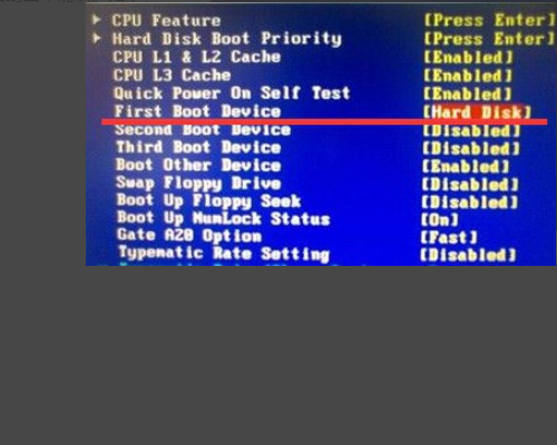 2、在打开的界面中,找到“First Boot Device”然后选中并且按回车键,然后在弹出的小窗口中选择[Hard disk]硬盘启动回车确认。如下图所示。