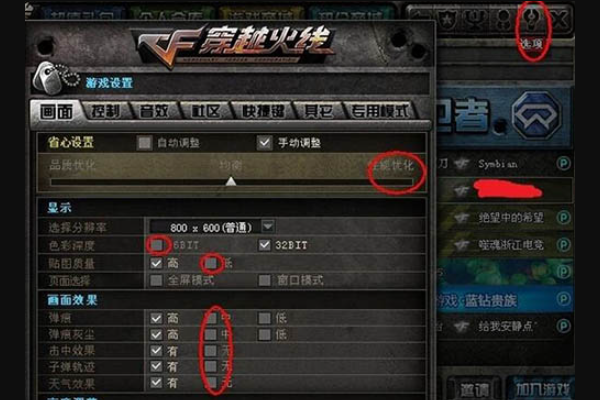 5、打开游戏,找到右上角的设置选项,色彩深度选择—16位,贴图质量选择—低,下面的动画效果可以根据自己的情况自由选择,最后一定要注意保存退出。