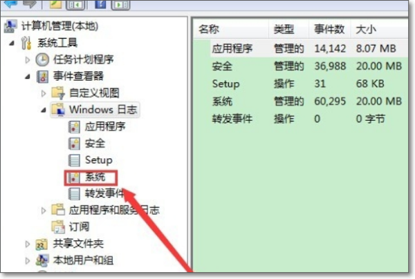 3. 展开系统工具,我们会看到有一个 事件查看器,继续展开会看到里边包含了一个 windows日志,再展开windows日志后,选择 系统