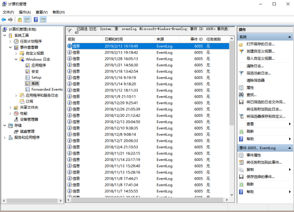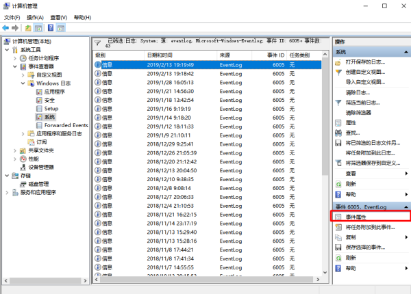 在“开始”菜单的运行”中输入“eventvwr.msc”,或者是按下"开始菜单"-"程序"-"管理工具"-"事件查看器",打开事件查看器,在左侧窗口中选择“系统”,从右侧系统事件中查找事件ID为6005、6006的事件(事件ID号为6005的事件表示事件日志服务已启动,即开机,同理事件ID:6006表示关机),它们对应的时间就分别是开机时间和关机时间。怎么查看上次电脑关机时间