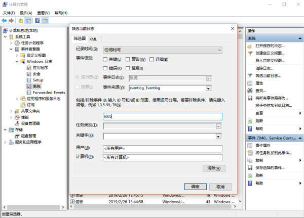 5. 跳转到筛选器弹框后,时间来源我们选择 “eventlog、Eventlog”两个选项;事件我们根据ID来匹配,开机事件ID:6005、关机事件ID:6006,输入后回车